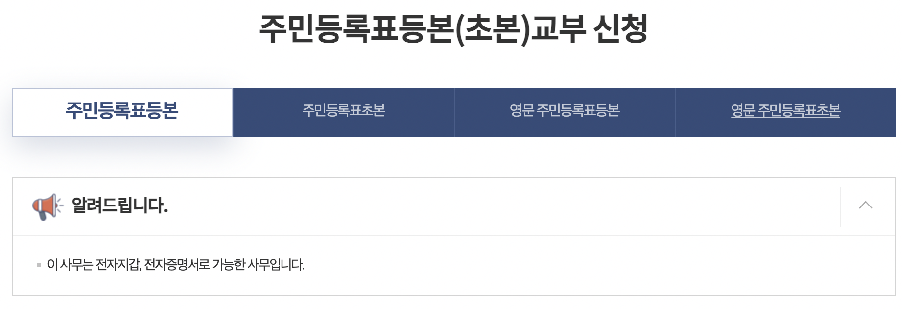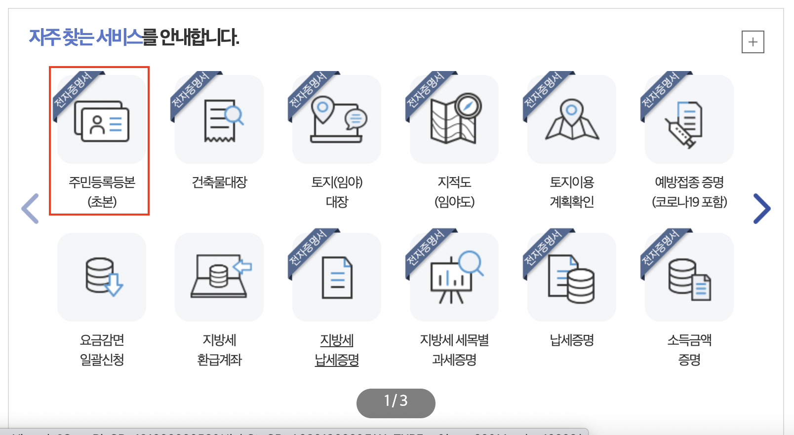 로그인을 한 후에 메인(첫페이지) 중간 부분에 보면 주민등록등본(초본)이라고 쓰여있는 아이콘을 찾을 수 있을 것이다. 이 아이콘을 클릭한다.