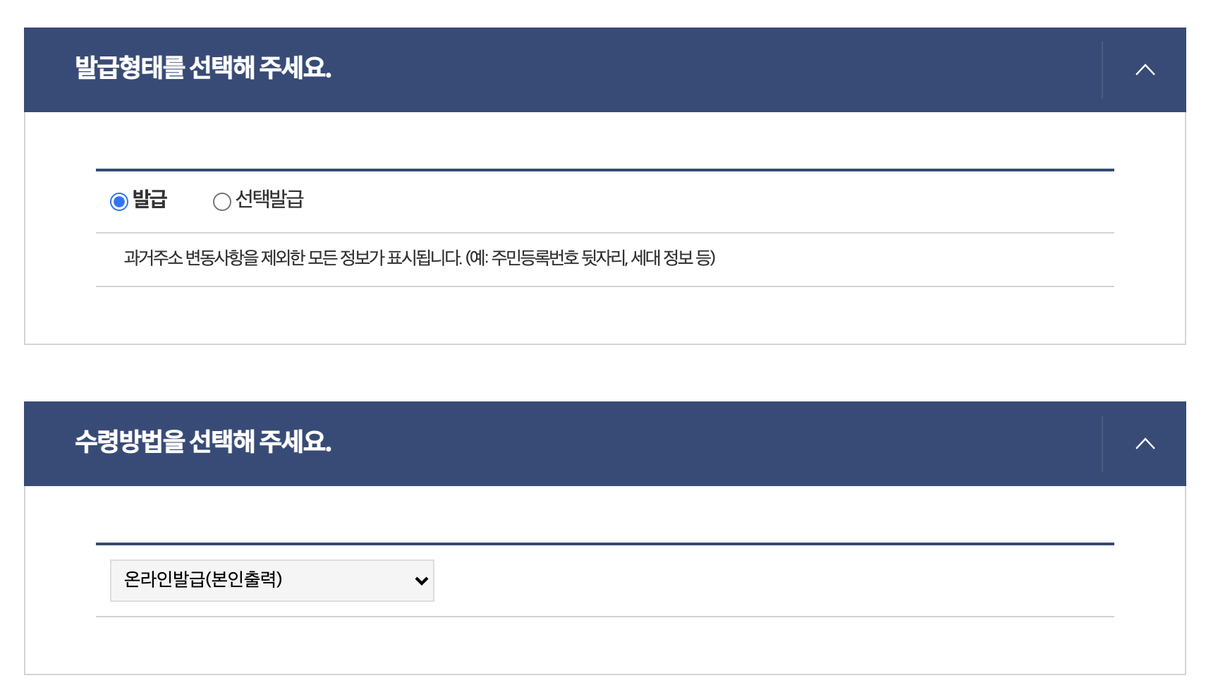 4가지 탭이 있는데 주민등록표등본으로 설정되어 있는지 한번 더 체크하자. 화면을 내리면 순서대로 주소, 발급형태, 수령방법 등을 설정할 수 있다. 연말정산 서류로 제출하기 위해서는 주민등록번호 뒷자리가 모두 표시된 주민등록표등본이 필요하다.