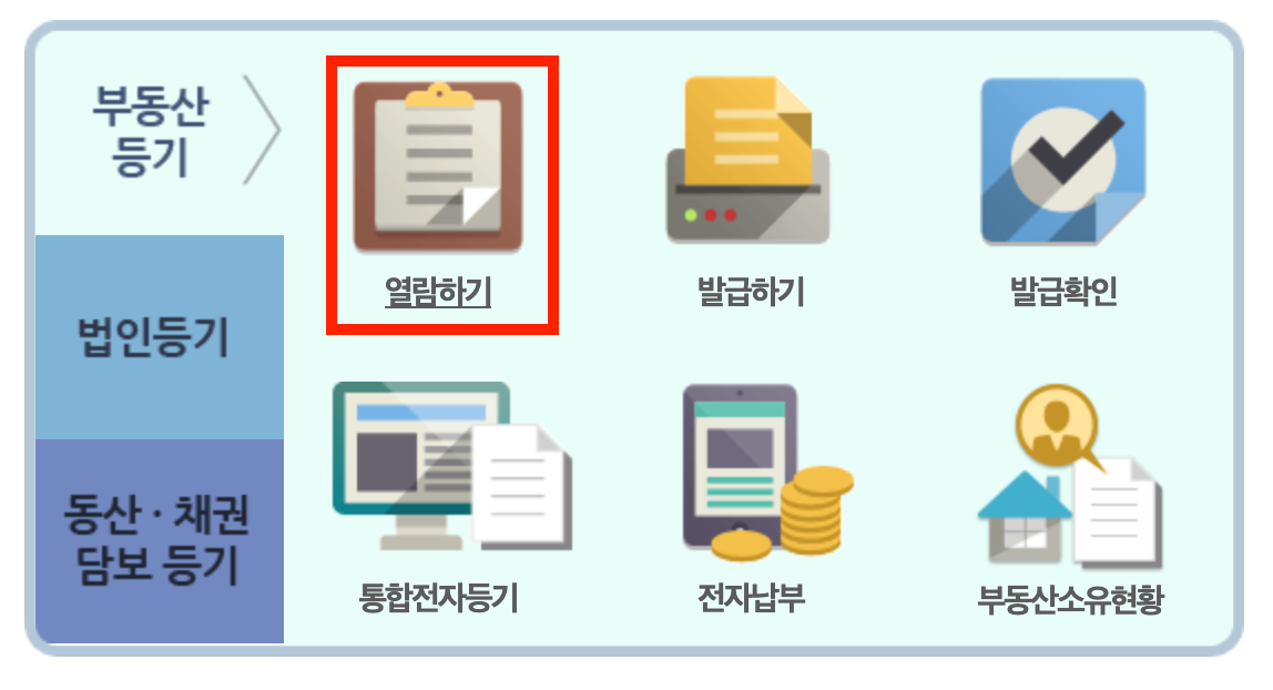 인터넷 등기소 홈페이지 중간 부분의 부동산 등기 > 열람하기를 클릭한다. 열람하기 페이지에서 간편검색, 소재지번으로 찾기, 도로명 주소로 찾기, 고유번호로 찾기, 지도로 찾기 중 본인에게 편한 방법을 선택하여 주소지를 검색하여 열람을 진행하면 된다.
