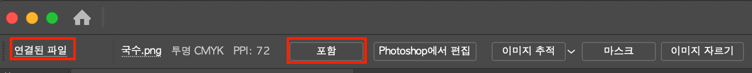 어도비 일러스트레이터 > 레이어 패널을 보면 <연결된...> 으로 표시된 레이어들을 발견할 수 있다. 해당 이미지를 선택하면 상단 메뉴바에서 연결된 파일이라는 정보를 확인할 수 있다. 메뉴바의 중간 부분에 보면 포함 이라는 버튼이 있는데 이 버튼을 클릭한다.