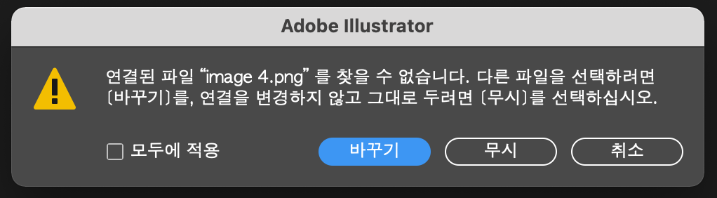 연결된 파일을 찾을 수 없습니다. 다른 파일을 선택하려면 [바꾸기]를, 연결을 변경하지 않고 그대로 두려면 [무시]를 선택하십시오.