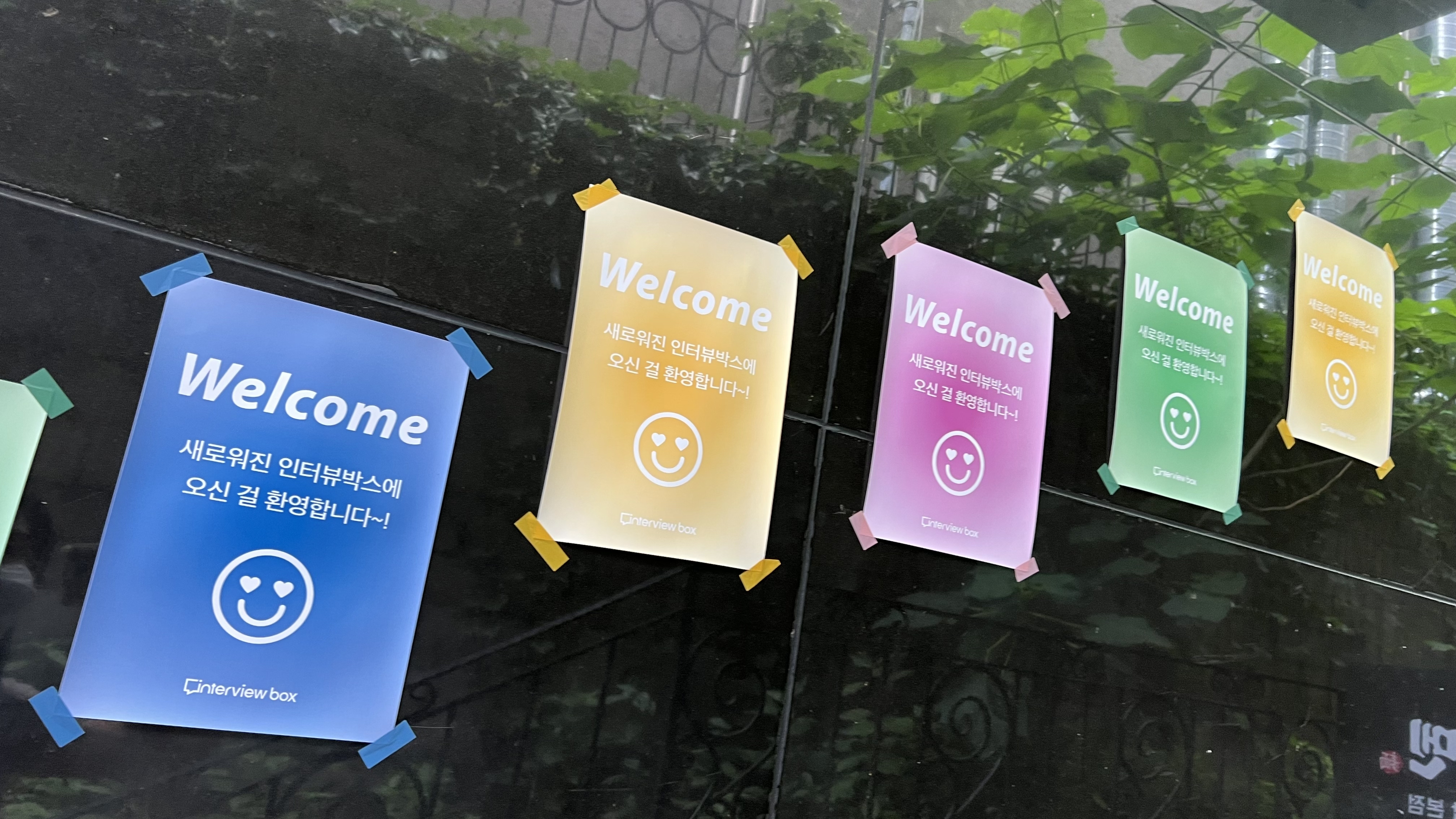 지도앱을 켜서 알려주는 방향대로 열심히 걷다 보니 (나는 친구들 사이에서도 소문난 길치...OTL) 인터뷰 박스라는 파란색 간판이 보였다. 인터뷰 박스는 3층에 위치해 있고, 2층 계단으로 올라가는 길에 welcome 포스터가 붙여져 있었다.