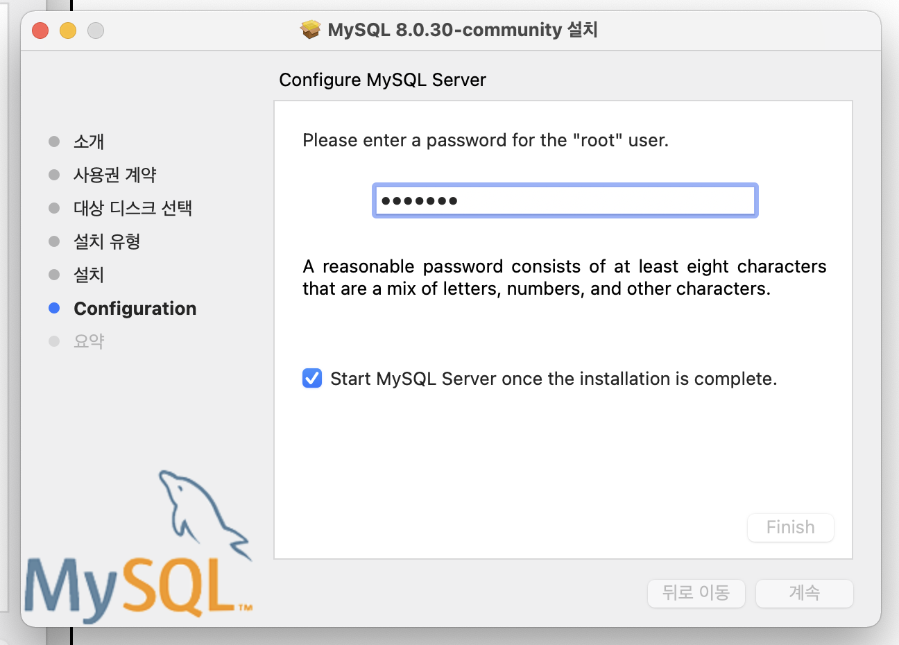 우리는 MySQL을 설치하고 난 후에 root라는 사용자 이름으로 서버에 접속하게 될 것이다. 그런데 서버에 접속할 때에는 비밀번호가 필요하고, 이 비밀번호를 설치하는 과정에서 입력하게 된다. ★지금 입력하는 비밀번호★는 서버 접속할 때 필요하니 절대 잊어버리지 않도록 하자!