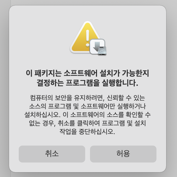 컴퓨터의 보안을 유지하려면 신뢰할 수 있는 소스의 프로그램, 소프트웨어만 실행하거나 설치하라는 경고 팝업이 하나 더 나타난다. 역시 위와 같은 이유로 '허용'을 선택한다.