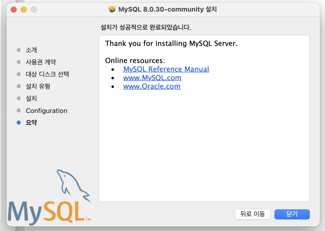 MySQL 설치가 성공적으로 완료되었다.