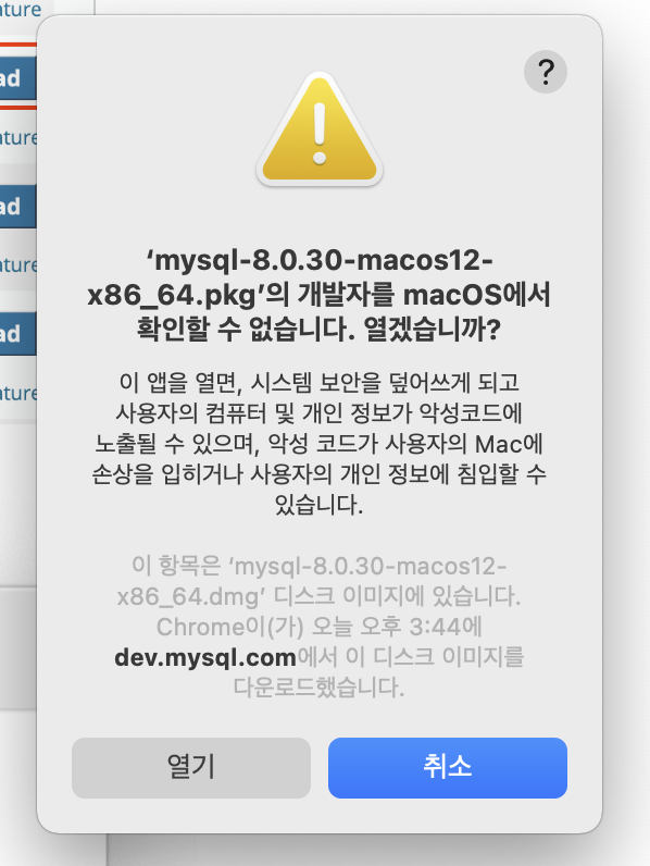 실행하면 개발자를 macOS에서 확인할 수 없다는 팝업창이 뜬다. 취소하면 MySQL을 설치할 수 없으므로(-_-) '열기'를 선택한다.