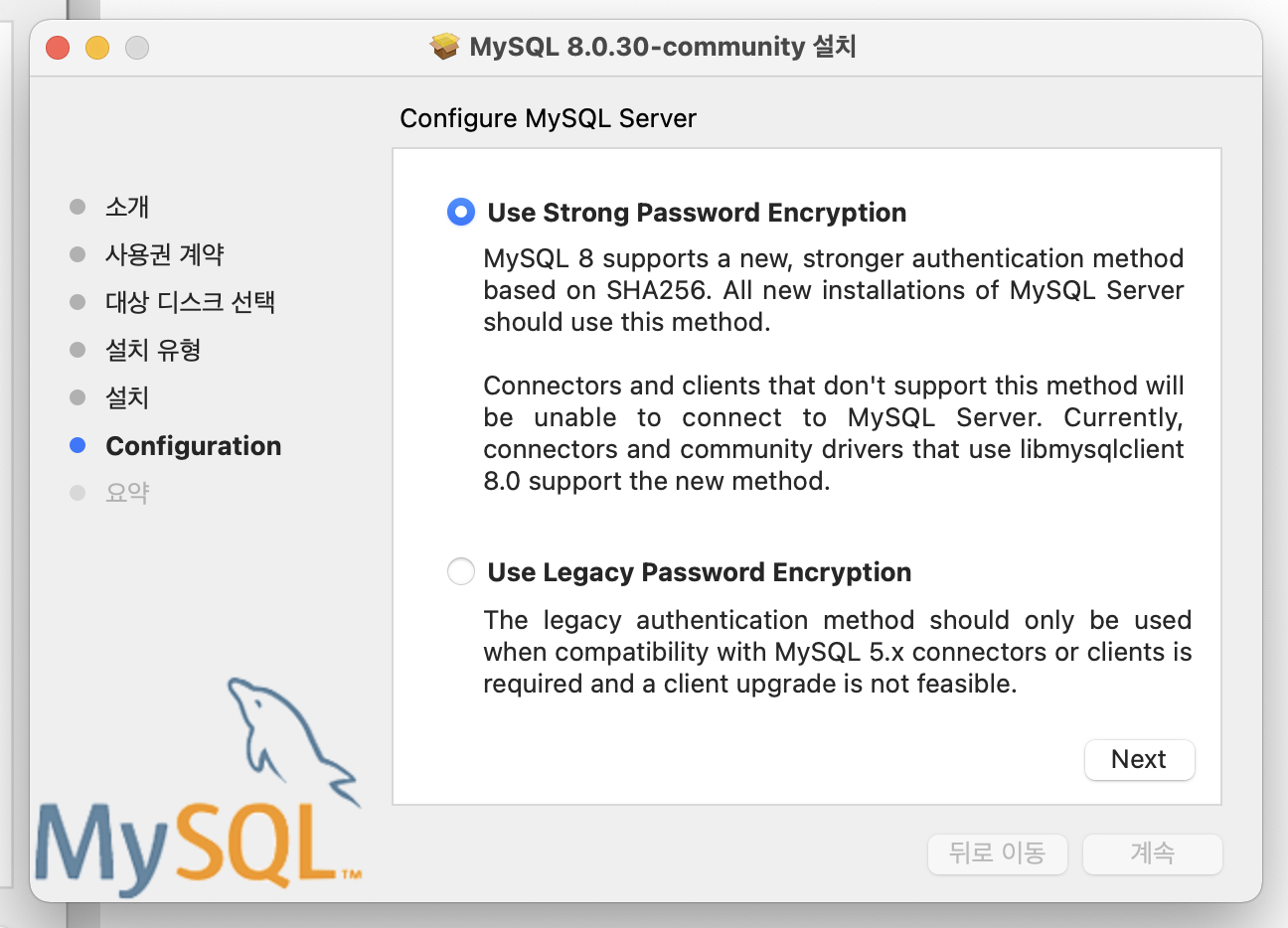 Use Strong Password Encryption에 두고 'Next' 버튼을 클릭한다. 다음이 중요하다!