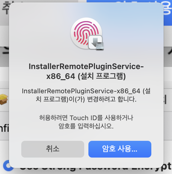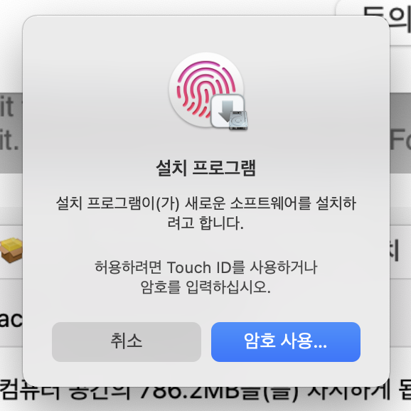 마지막으로 한 번 더 TouchID, 암호 입력으로 상태를 허용해준다. 설치 한 번 하는데 암호 입력을 몇 번을 하는거야...OTL