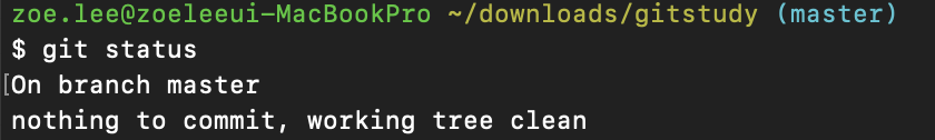 On branch master nothing to commit, working tree clean. 워킹 트리(Working Tree = Working Directory)가 깨끗하다는 의미이다. 참고로 알아두도록 하자.