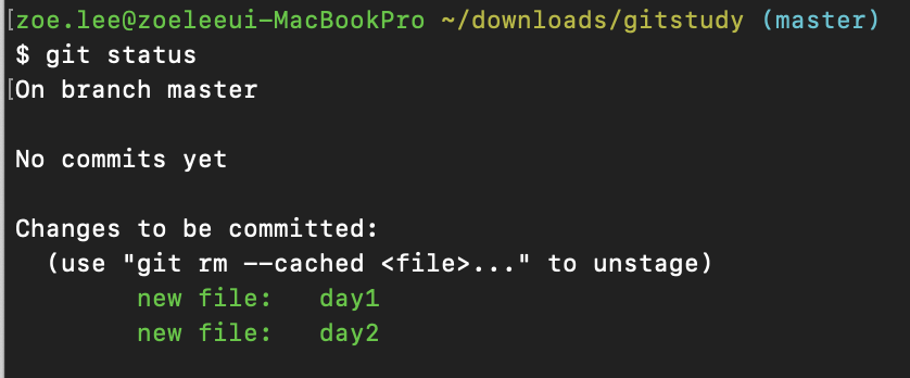 상황을 설명하자면, downloads > gitstudy 디렉토리 안에 day1, day2 파일을 새로 생성했다. 그리고 git add 명령어를 사용해 두 개의 파일을 Staging Area에 추가했다. 그 다음 git status 명령어를 통해 해당 영역의 상태를 확인하면... 아래와 같은 정보를 얻을 수 있다. (day1, day2 모두 제대로 추가되어 있음)