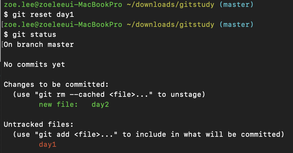 그런데 생각해보니 day1은 잘못된 파일이어서 commit을 하면 안되는 것이었다. 하지만 이미 그 파일은 Staging Area에 추가되어 있는 상황... 이걸 다시 밖으로 빼내고 싶은데...🥲 그럴 때 사용할 수 있는 명령어가 바로 git reset 이다.