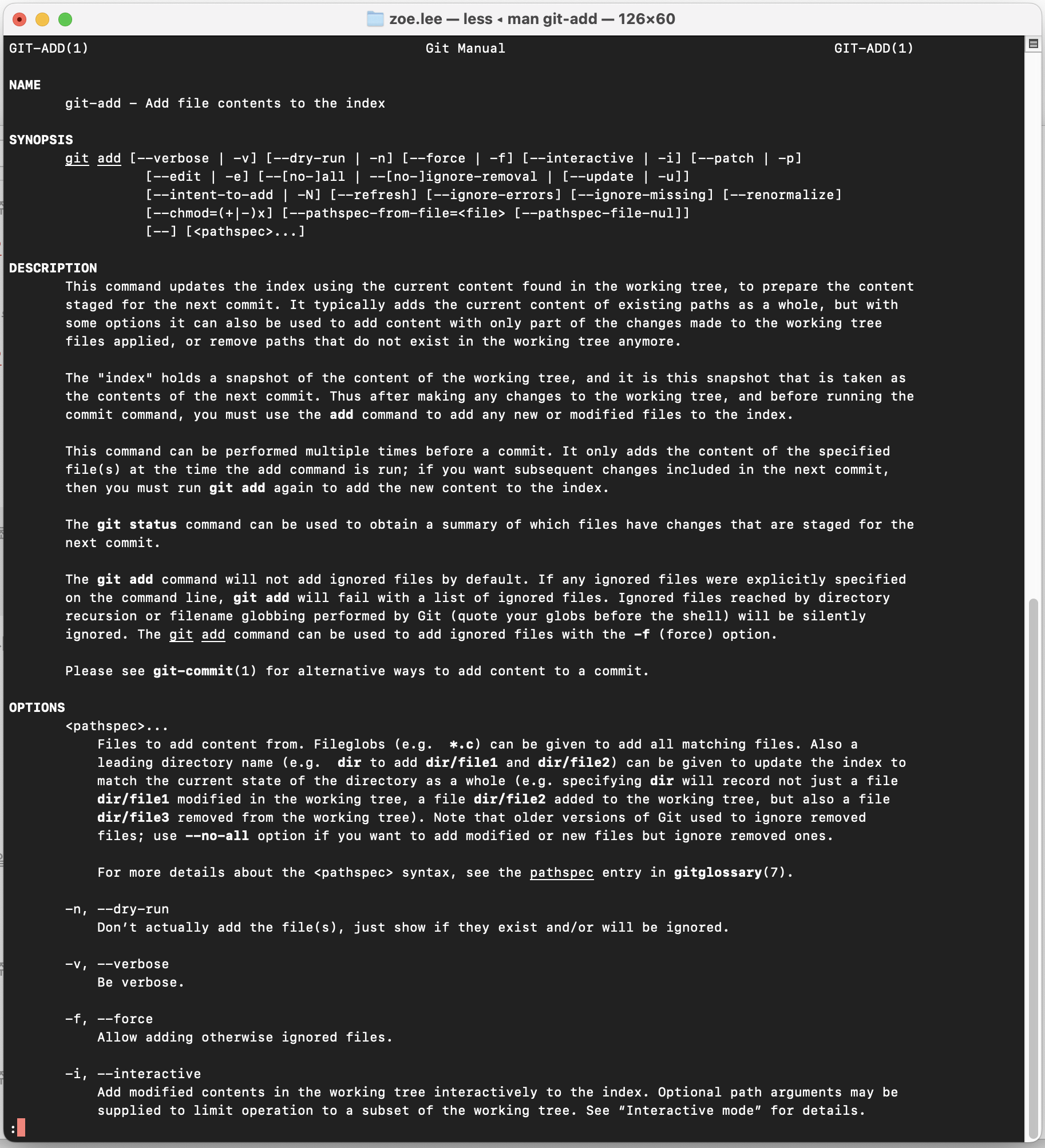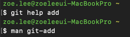 를 입력해서 실행하면 되는데 [명령어] 자리에 git 뒤에 오는 명령어 알파벳을 입력하면 된다. 대괄호는 구분하기 쉽도록 사용한 것으로 실제 터미널에서는 함께 쓰지 않도록 한다. 쉽고 빠른 이해를 위한 예제 한가지! 변경한 파일을 Staging Area에 추가하는 명령어인 git add의 도움말을 찾는 방법을 아래에 소개하도록 하겠다.