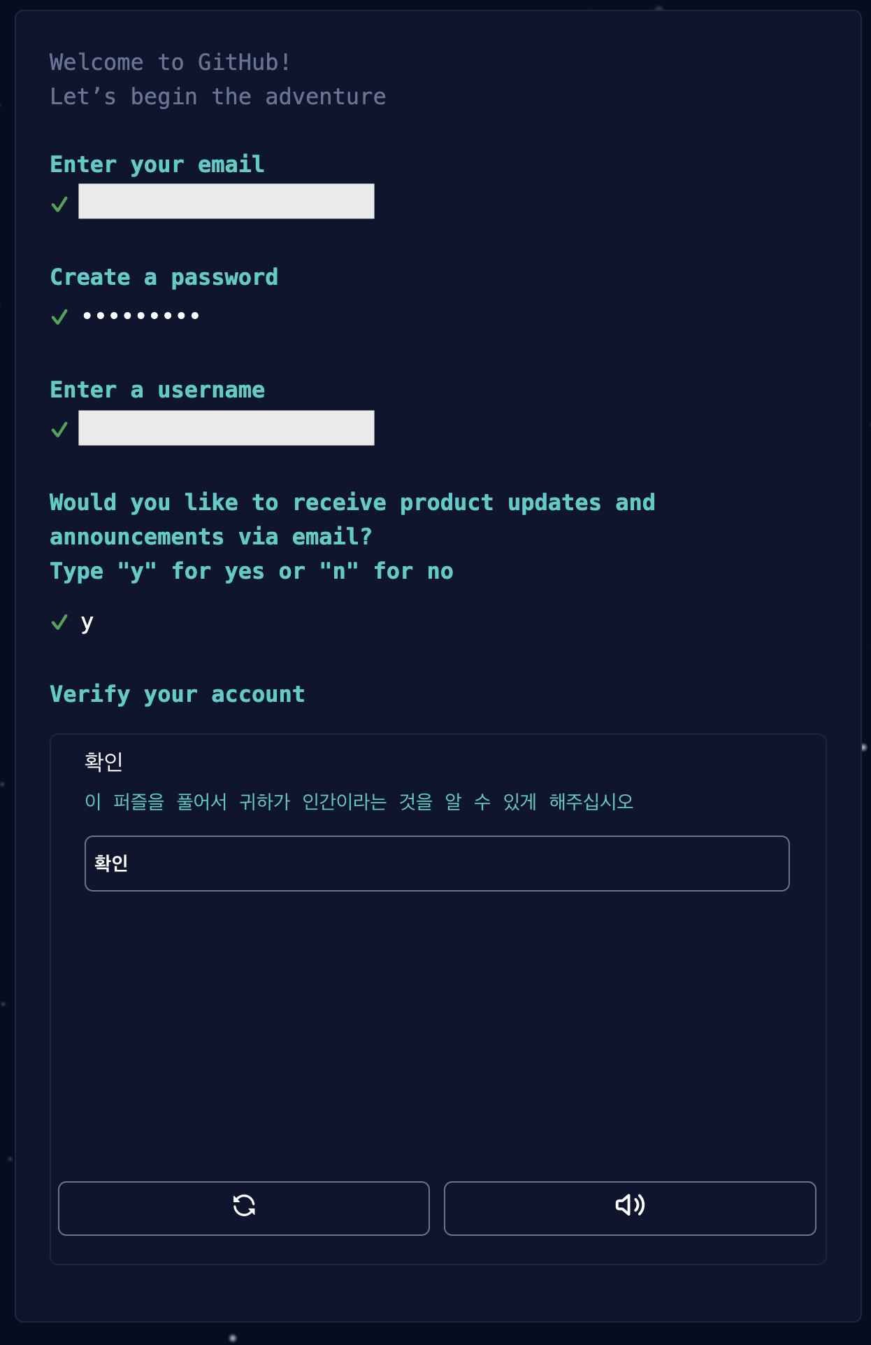 이메일 입력 후 순서대로 비밀번호(password), 사용자 이름(username)을 입력하고 이메일 수신 여부도 체크한다. 마지막으로 본인이 인간이라는 것을 인증(-_-)하는 퍼즐도 풀어야 한다.