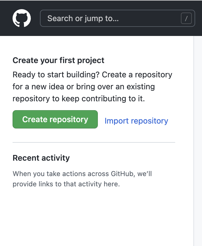깃허브(Github) 회원가입을 마쳤다면 이제 Remote Repository를 생성해보도록 하겠다. 로그인 후에 좌측 상단의 깃허브 로고를 클릭하면 첫페이지로 이동할 수 있다. 그 후 로고 바로 아랫 부분에서 Create repository 라고 쓰여있는 초록색 버튼을 발견할 수 있을 것이다. 클릭!