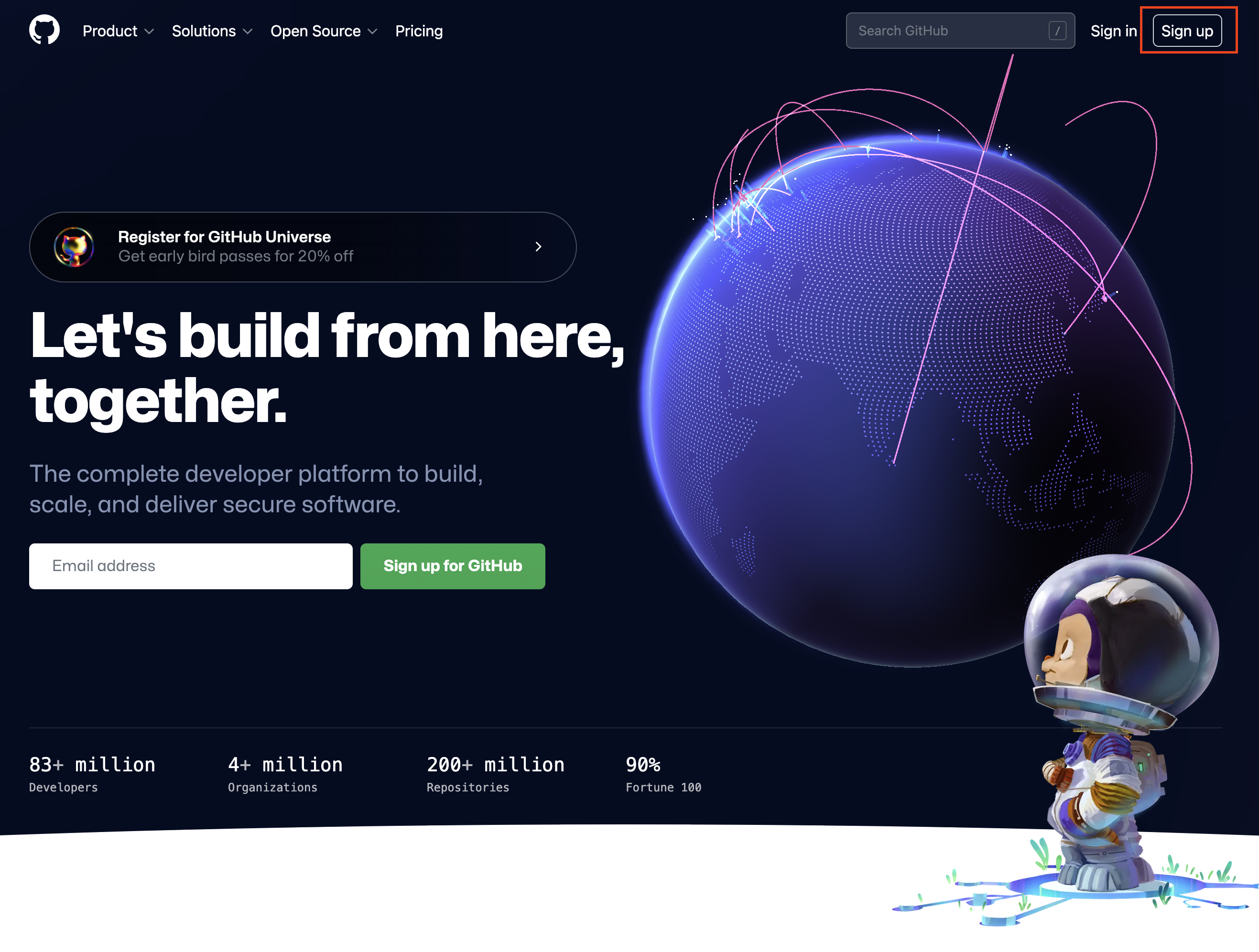 Github 웹사이트에 방문했다면 우측 상단에 위치해 있는 Sign up 이라고 쓰여있는 버튼을 클릭한다.