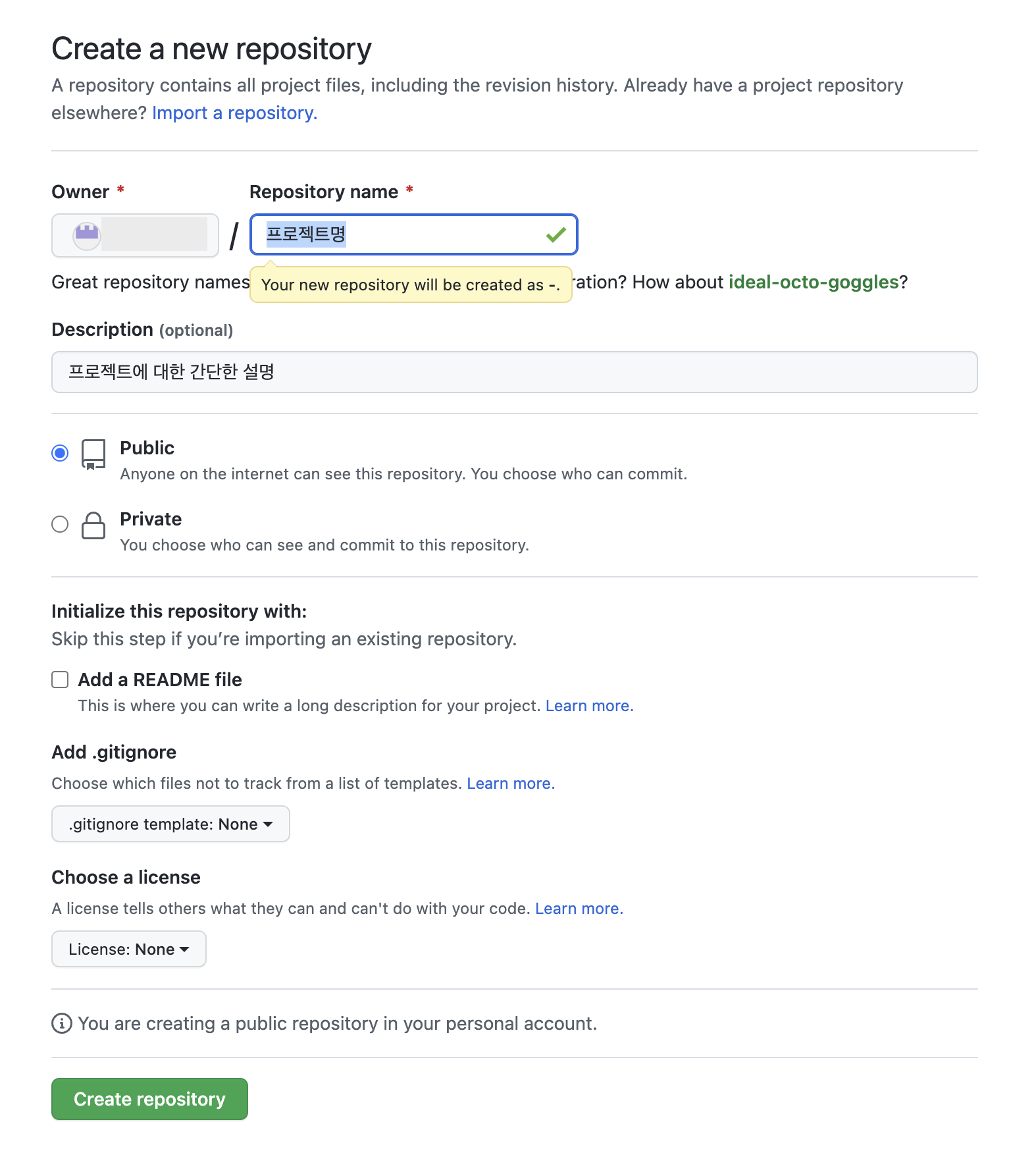 버튼을 클릭하면 Create a new repository 라는 화면으로 이동한다. Repository name 부분에 프로젝트명을 쓰고, Description(Optional) 부분에 프로젝트에 대한 간단한 설명을 쓰면 된다. 나는 해당 프로젝트를 모두에게 공개할 것이기 때문에 Public에 체크했는데 만약 이 프로젝트를 공개하고 싶지 않다면 Private에 체크해야 한다.