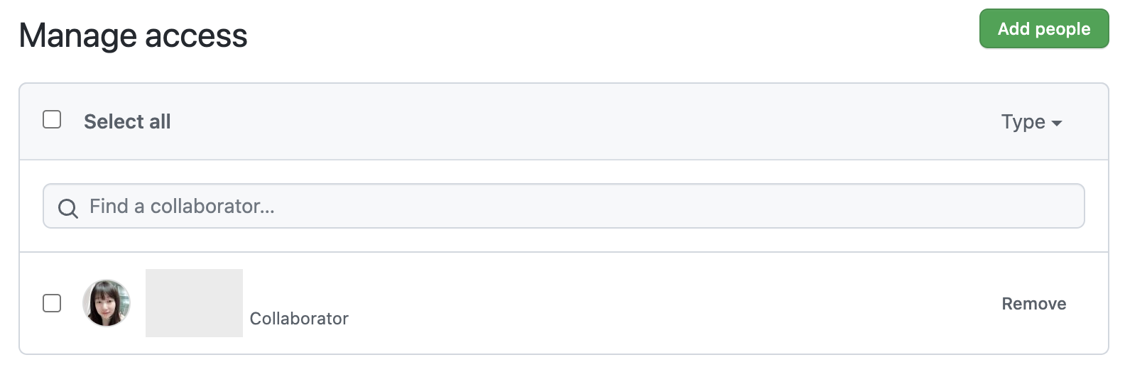 다시 처음 계정으로 접속해 보았다. Manage access에서 추가된 collaborator를 확인할 수 있었다.