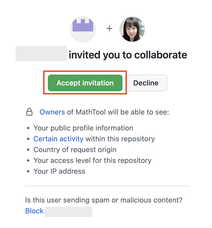 버튼을 클릭하면 Github 홈페이지로 이동한다. Accept invitation 초록색 버튼을 눌러서 협업(collaborate)을 수락했다.