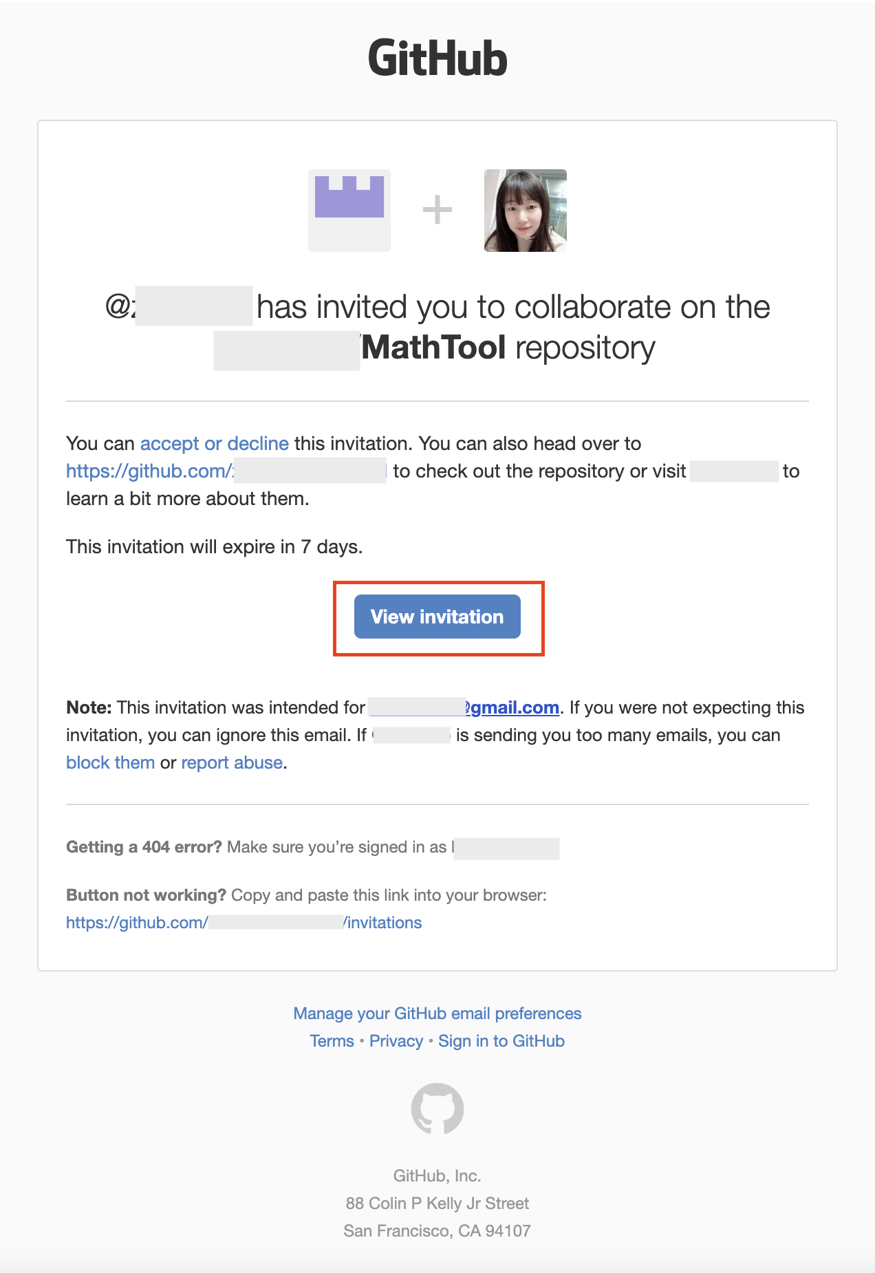 초대받은 사용자 계정 이메일로 들어가 보았다. 깃허브에 repository에 초대되었다는 내용의 이메일이 도착해 있었다. View invitation 파란색 버튼을 클릭했다.
