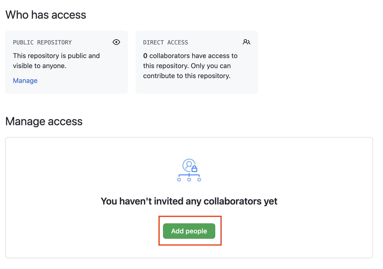 비밀번호 입력 후에 화면이 바뀐다. 한 번도 동료를 추가한 적이 없다면 중간 부분에서 You haven't invited any collaborators yet.라고 쓰여있는 박스를 발견할 수 있을 것이다. 텍스트 아래에 있는 Add people 초록색 버튼을 선택한다.