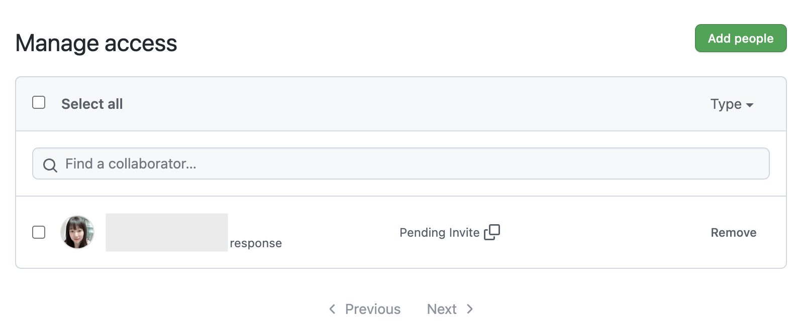 다시 처음 계정으로 접속해 보았다. Manage access에서 추가된 collaborator를 확인할 수 있었다.