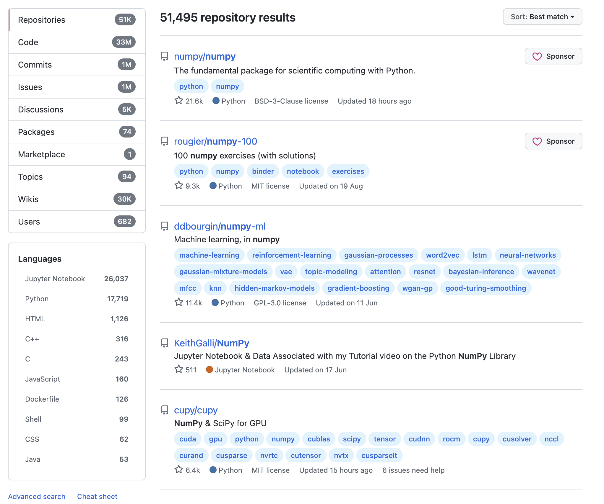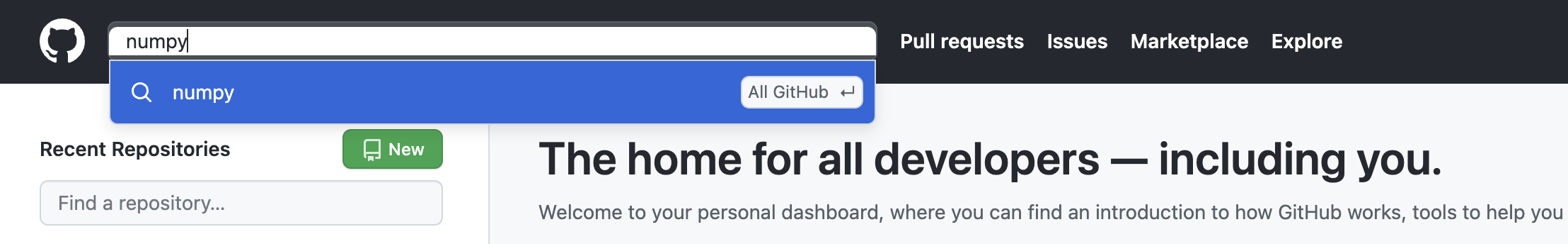 이 포스팅에서는 파이썬 수치 계산용 라이브러리인 numpy를 가져와보려고 한다. numpy는 과정을 설명하기 위한 예시 프로젝트이며, 본인이 관심 있는 오픈 소스 프로젝트 하나를 선택해서 같은 방법으로 옮기면 된다. 먼저 깃허브 홈페이지에 들어가서 검색창에 numpy(=원하는 프로젝트명)를 입력하고 검색해보자.