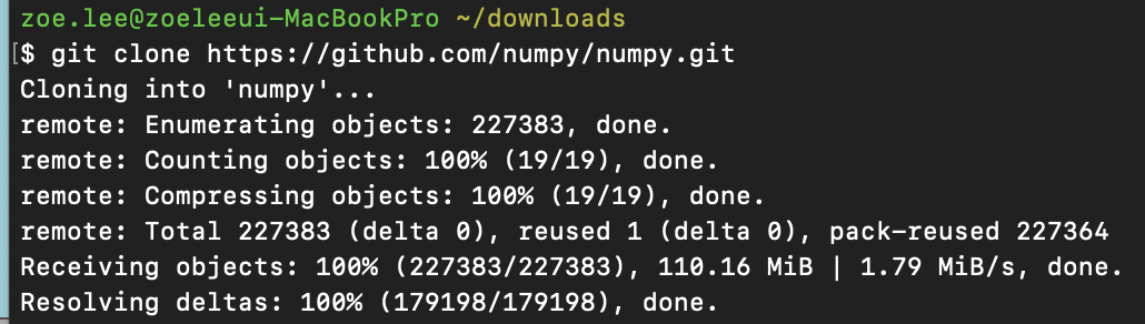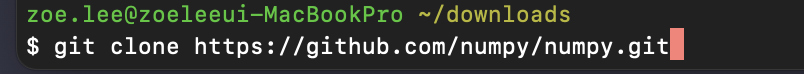 터미널에서 numpy 프로젝트를 옮기고 싶은 경로로 이동한다. 나는 downloads 폴더 안에 넣으려고 한다. 그 다음 아래와 같이 명령어를 입력한 후에 엔터키를 누른다.