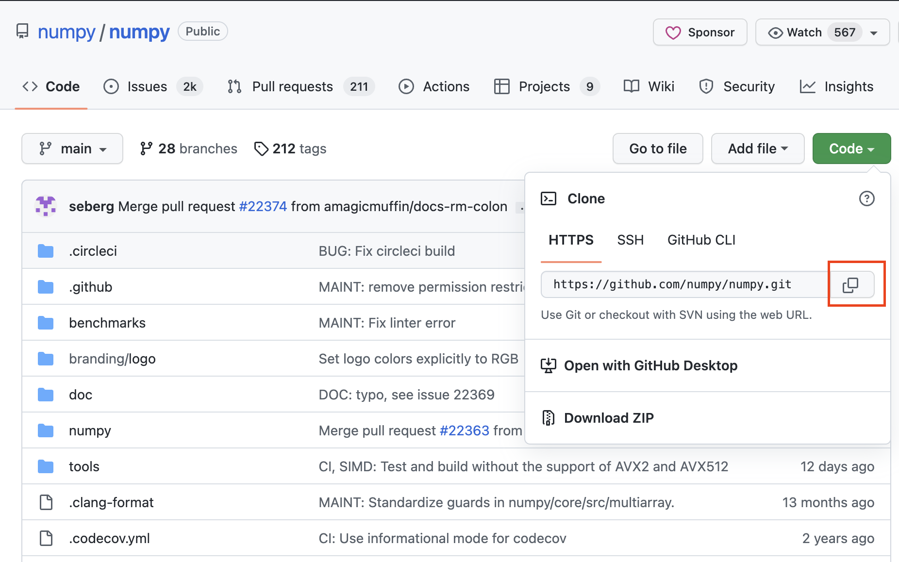 numpy 프로젝트 안에 어떤 폴더와 파일들이 들어있는지 확인할 수 있다. 우측 상단의 Code를 선택하여 HTTPS 링크를 복사한다. 링크를 복사했다면 내 pc의 터미널을 실행한다.