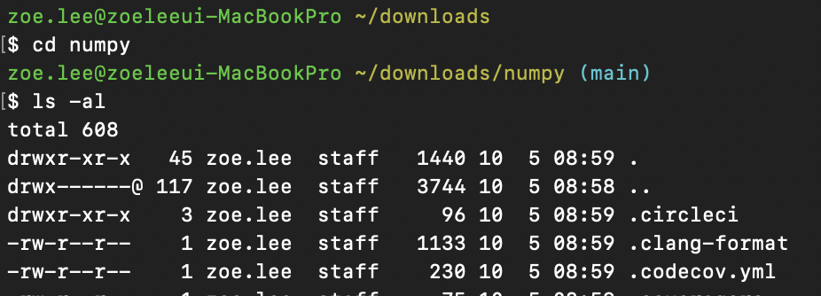 이번에는 터미널에 cd numpy 명령어를 실행해서 numpy 디렉토리로 이동했다. ls -al 명령어를 이용해서 numpy 안에 어떤 파일들이 들어있는지 확인해보기도 했다.