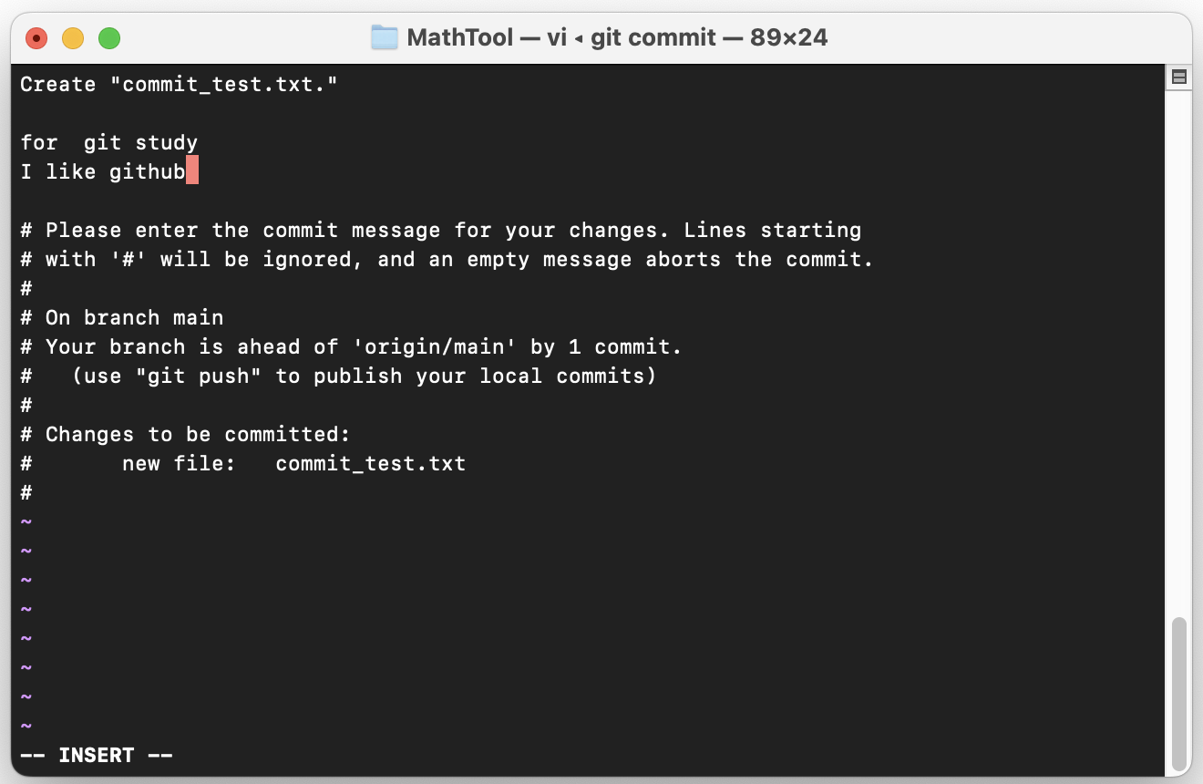 i 키를 누르면 상태가 -- INSERT -- 로 변경(하단에서 확인 가능)되며 커서가 보일 것이다. 커밋 메세지를 작성한다.