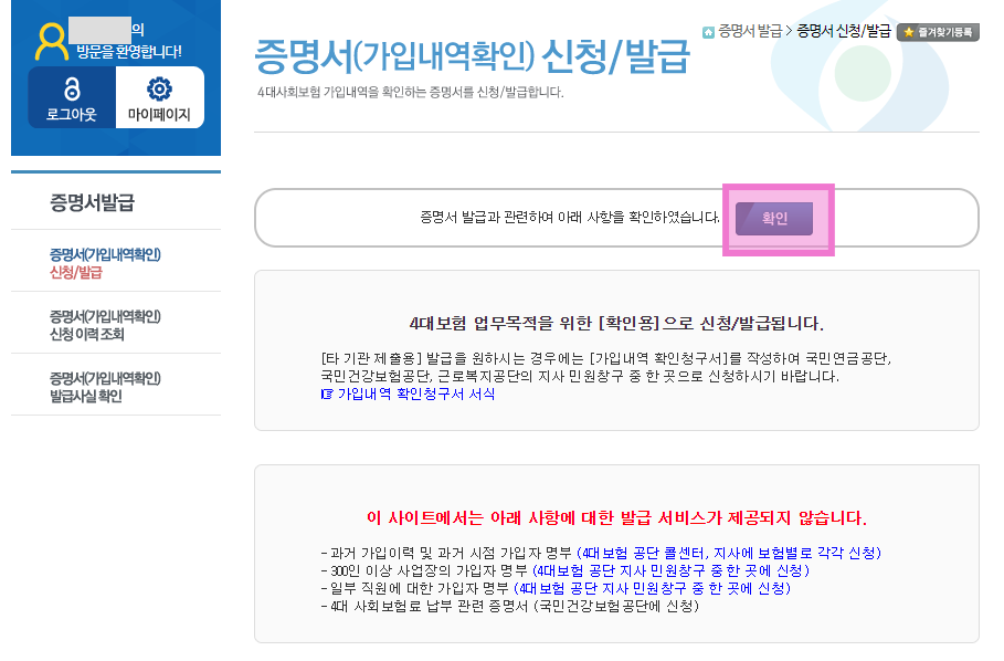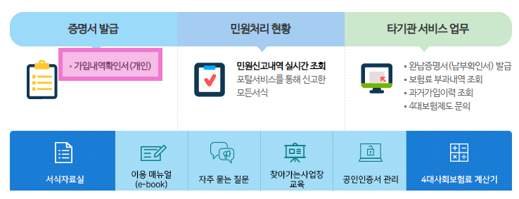 가장 먼저 공유할 내용은 4대 사회보험 가입자 가입내역 확인서 발급받는 방법이다.
