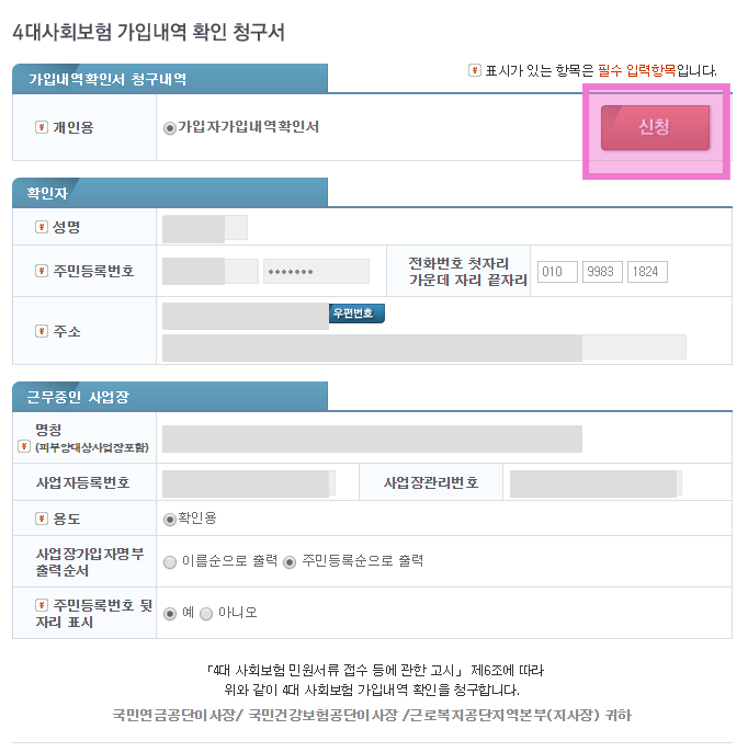 성명, 주민등록번호, 주소 등의 정보가 제대로 입력되어 있는지 확인한 후에 근무중인 사업장 옵션을 설정한다. 사업장 가입자명부 출력순서(이름순 or 주민등록순)나 주민등록번호 뒷자리 표시여부 등을 선택할 수 있다. 모든 항목을 확인했다면 신청 버튼을 클릭한다.