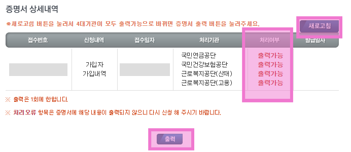 모두 출력가능으로 바뀐 것을 확인하고 아래 출력 버튼을 누르면 4대 사회보험 가입자 가입내역 확인서 발급 완료!