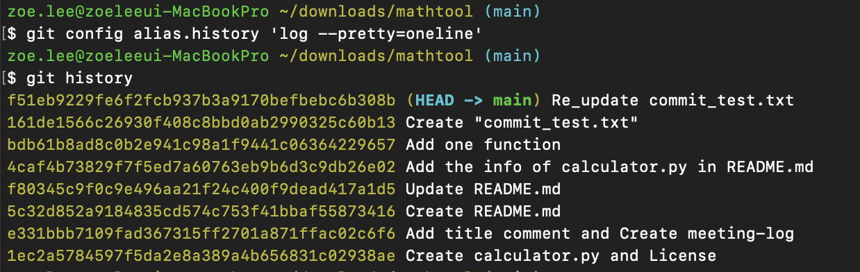 위와 같은 설정을 해 두면 앞으로 git log --pretty=online 대신에 더 짧은 커맨드인 git history로 원하는 결과를 얻을 수 있다. 설정 시 주의할 점은 git을 제외한 커맨드(+옵션)를 써 주어야 한다는 점이다. 깃을 사용할 때 필수적으로 알고 있어야 하는 내용은 아니지만 그래도 업무 효율을 높이는 데에 도움이 될 것 같아서 블로그에 정리해 보았다.