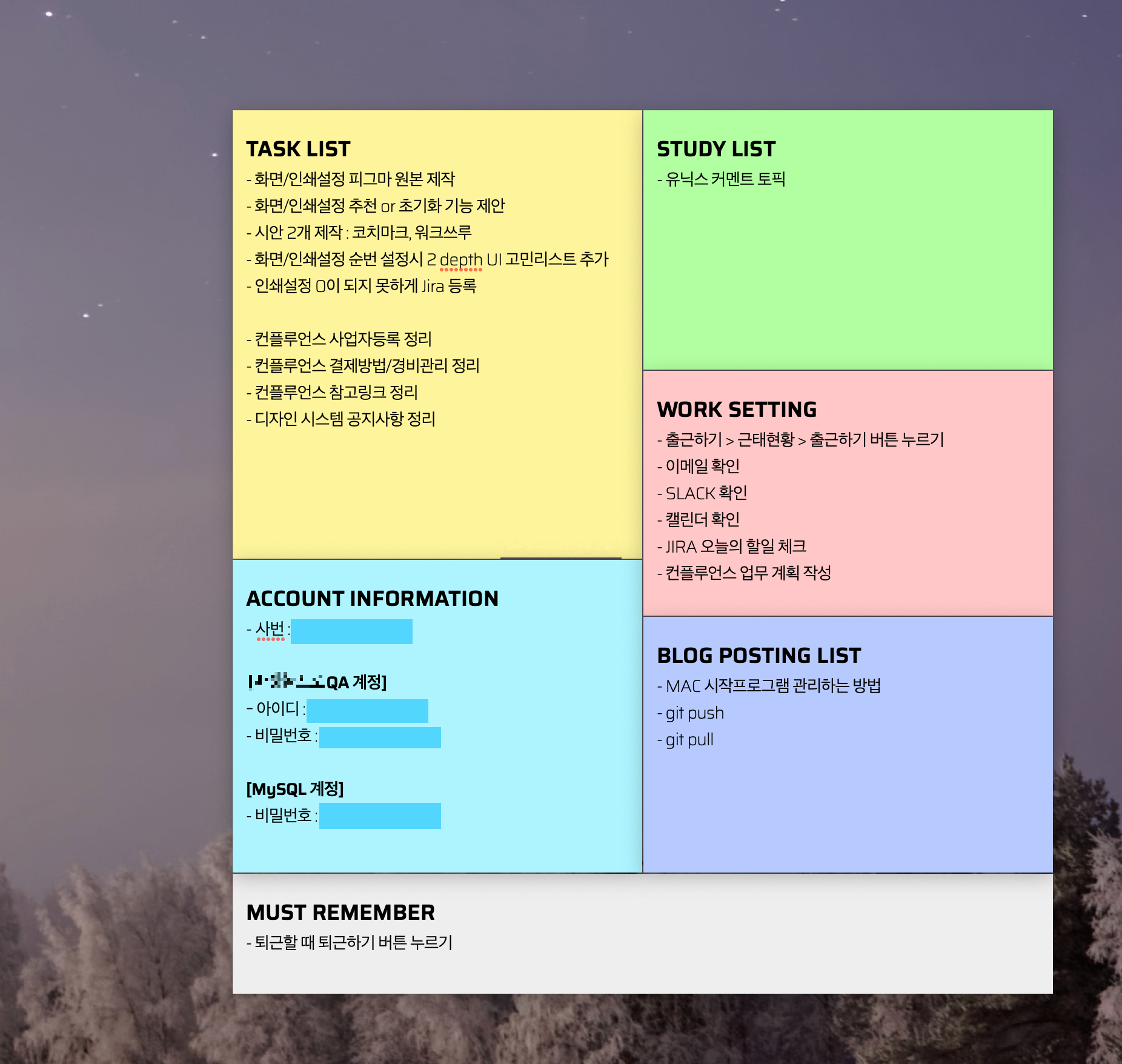 회사 업무시 필요한 내용을 기록해두려고 MacOS의 스티커 프로그램을 사용했다. 스티커 사이즈도 조정해서 예쁘게 정리를 하고 보니... 어라? 이거 맥북 재부팅하면 다시 시작해야 하는건가? 궁금해서 시스템 재시작을 해 보았는데 예상대로 스티커 프로그램을 다시 실행해야 하고, 정렬도 제멋대로였다 OTL