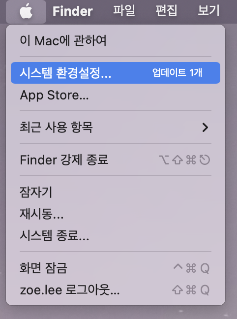 먼저 시스템 환경설정으로 들어간다. 바탕화면 Dock 메뉴에 있는 아이콘을 클릭해도 되고, 좌측 상단 사과 아이콘 > 시스템 환경설정을 클릭해도 된다.