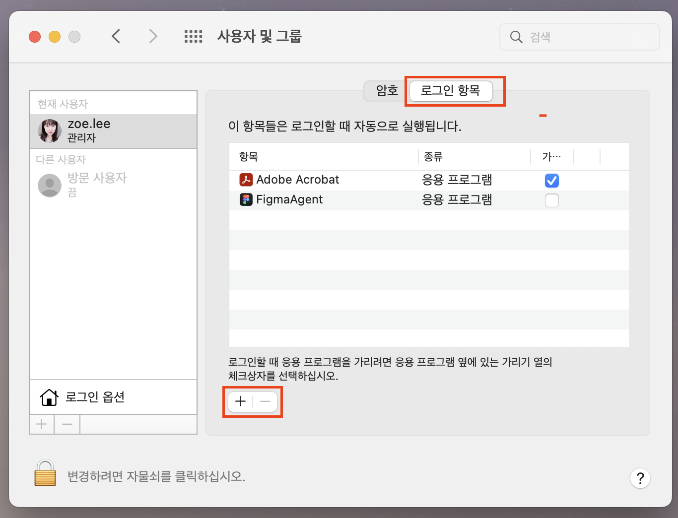 사용자 및 그룹 화면에서 '로그인 항목' 탭을 선택하고, 리스트 아랫 부분에 있는 플러스(+) 버튼을 클릭한다.