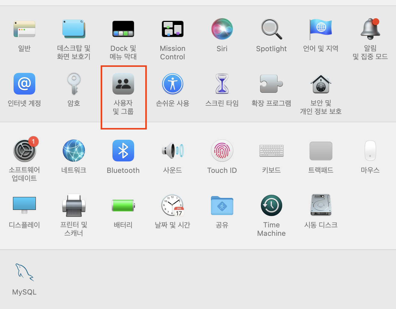 시스템 환경설정을 선택하면 다양한 설정 항목이 나온다. 상단 두번째 줄에 위치한 '사용자 및 그룹'을 선택한다.