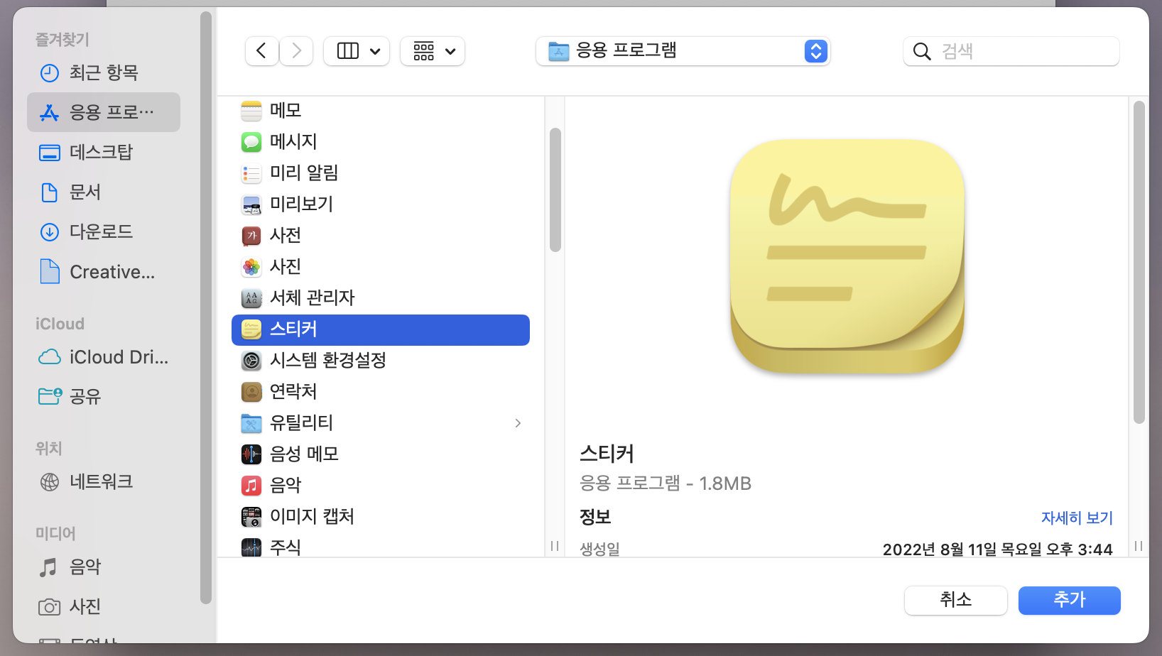 그러면 파일 or 프로그램을 선택할 수 있는 새 창이 나온다. 나는 스티커 프로그램을 맥 부팅 시 자동 실행되도록 설정할 예정이기 때문에 응용 프로그램 > 스티커 프로그램을 선택하고 '추가' 버튼을 눌렀다.