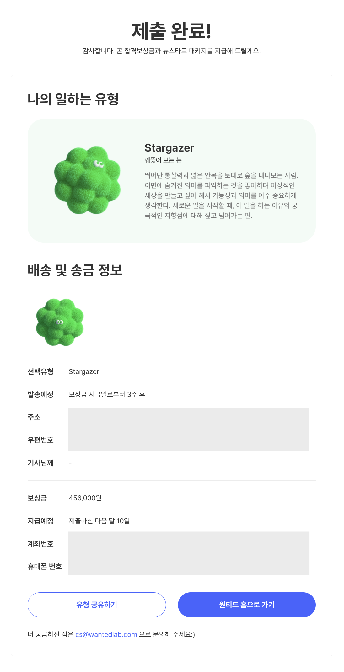 8월 1일에 첫출근을 하여 3개월의 수습 기간을 마치고 드디어, 정직원이 되었다. 원티드에서는 자사의 서비스를 이용하여 취업에 성공한 후 3개월동안 근무한 사람들에게 합격보상금을 지급하고 있다. 나도 조건이 되어 합격보상금 신청 안내 메세지를 받았다.