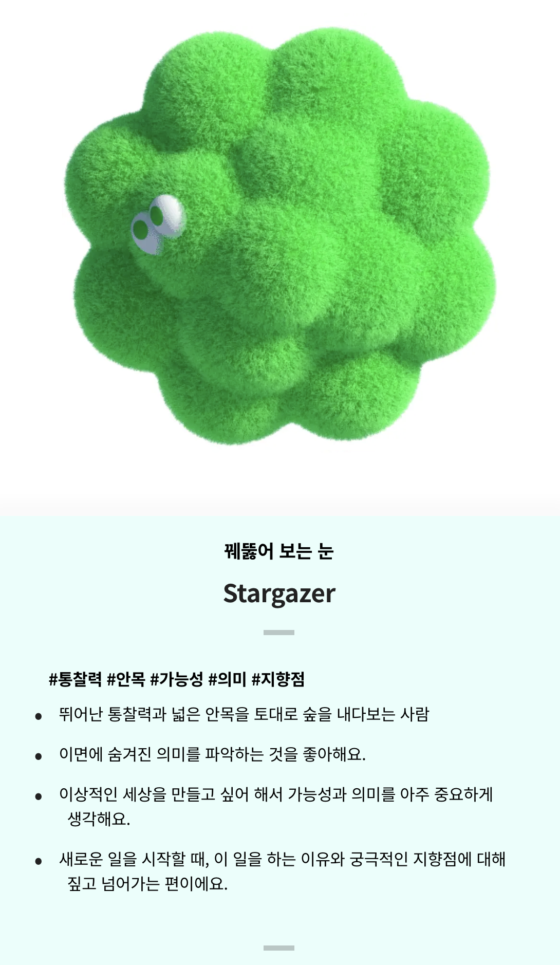 - 이상적인 세상을 만들고 싶어해서 가능성과 의미를 아주 중요하게 생각해요.