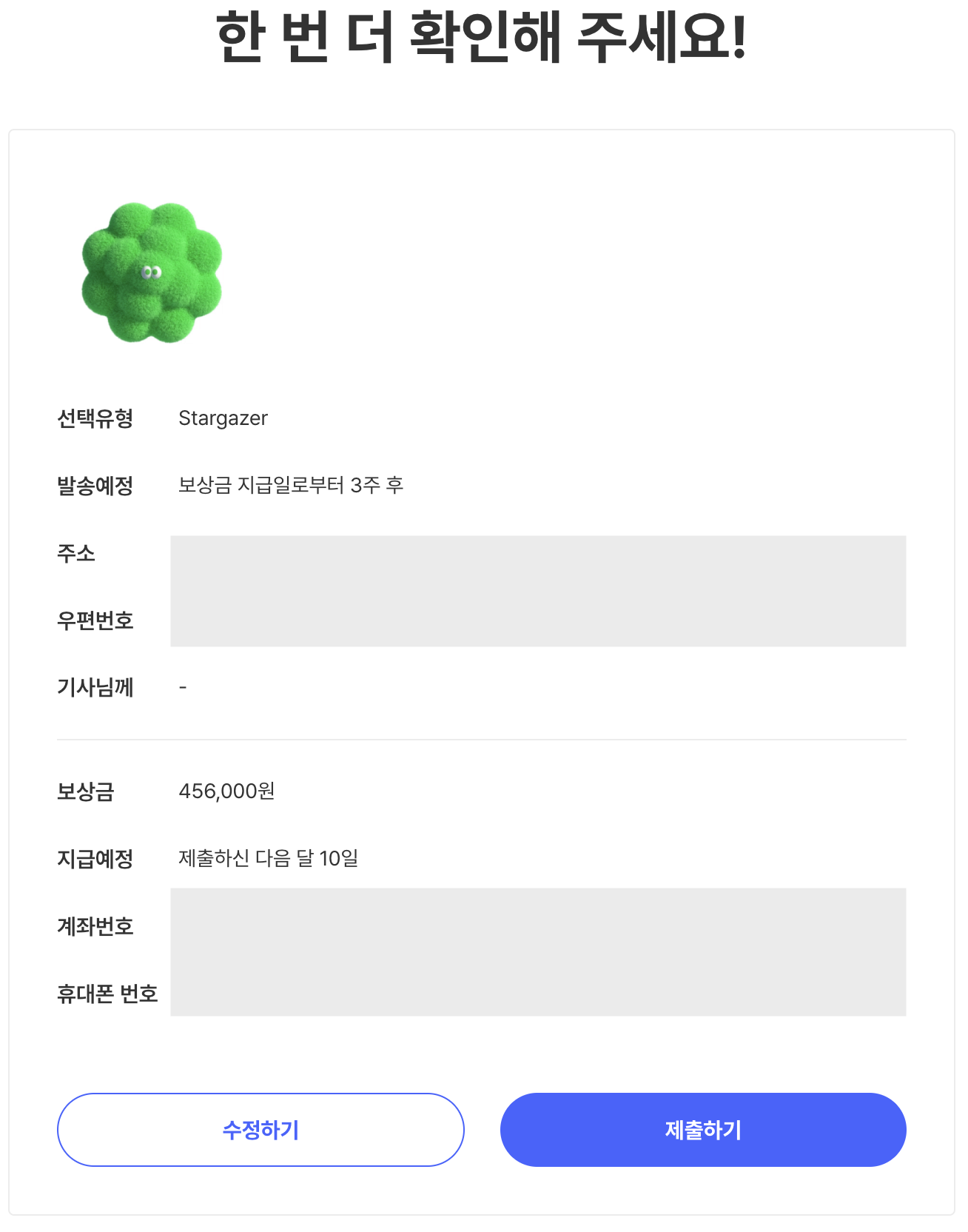 입력한 사항이 맞는지 한 번 더 확인한 후에 제출하기 버튼을 누른다. 뉴스타트 패키지는 보상금 지급일로부터 3주 후에 발송된다고 한다.