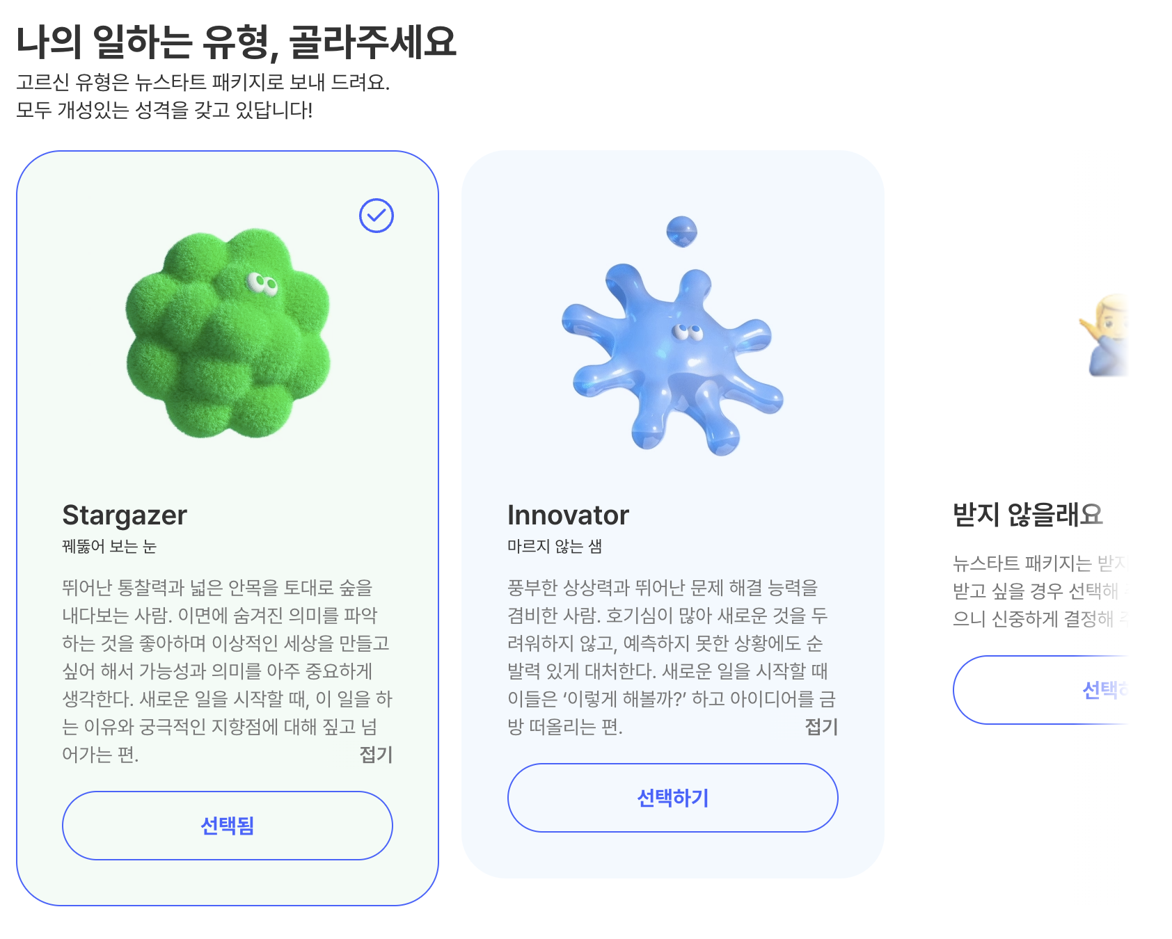 내가 일하는 유형을 골라달라고 하는데 결정장애인 나는 쉽게 고를수가 없다(...) 고민하다가 직접 유형 테스트를 한 후에 해당되는 뉴스타트 패키지를 선택하기로 했다.