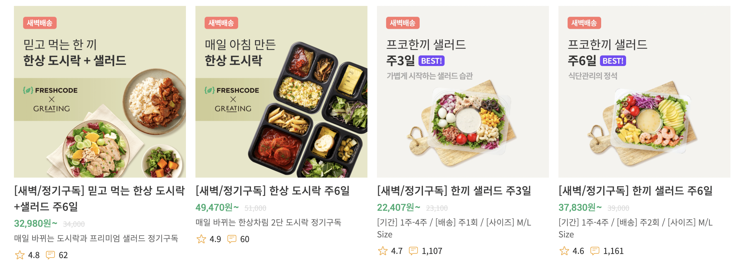 그래서 결심했다. 회사에서 점심으로 샐러드를 먹어보기로! 샐러드 구독 업체가 여러군데 있는데 나는 그 중에서도 프레시코드를 선택했다.