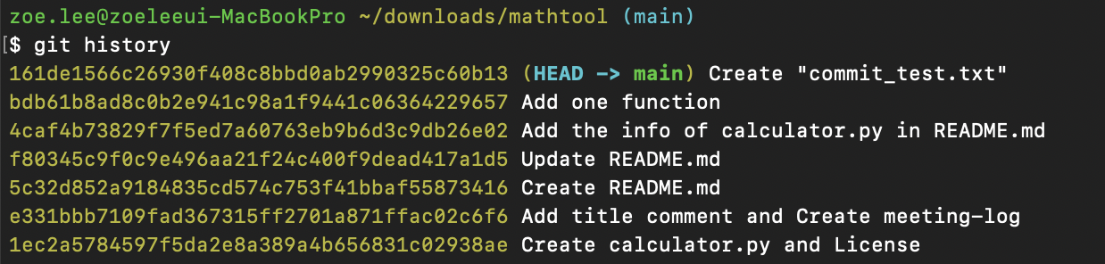 --hard 옵션을 사용한 git reset은 특정 시점으로 리셋하고 나면 이후의 작업 내용은 모두 사라지게 된다. 그렇기 때문에 신중하게 써야하는 명령어이며, 옵션은 총 3가지가 있는데 이 부분도 매우 중요한 부분이라 이 포스팅을 끝까지 읽기를 바란다. 그럼 예제를 통해서 알아보도록 하겠다. 먼저 git history 명령어를 사용하여 아직까지 한 커밋 리스트를 확인해 보았다.