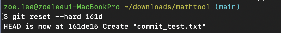 나는 git reset --hard 161d를 입력하여 바로 이전 커밋으로 되돌려 보았다. 다시 커밋 리스트를 실행하면 가장 최근의 커밋 내용은 사라지고, HEAD가 161d로 시작하는 Create "Commit_text.txt" 커밋을 가리키고 있는 것을 알 수 있다.