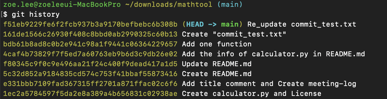 HEAD가 가장 마지막에 한 Re_update commit_text.txt 커밋을 가리키고 있다. 참고로 현재 HEAD가 가리키고 있는 커밋 버전은 (HEAD -> main) 표시를 통해서 확인이 가능하다.