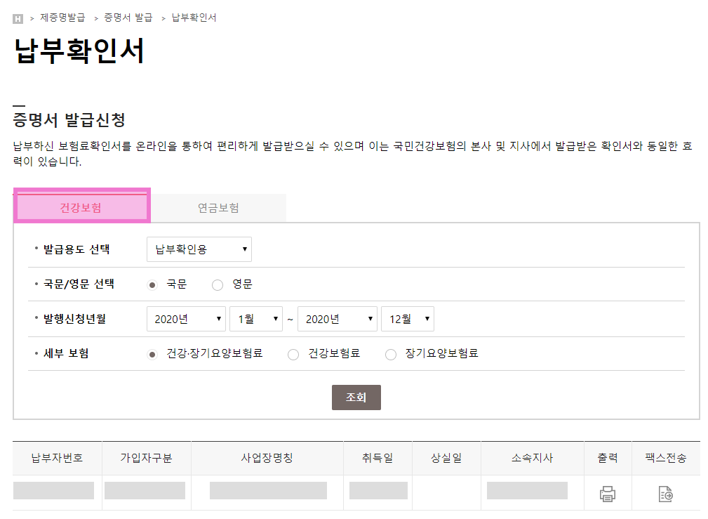 납부확인서 중간 부분에서 건강보험이 선택되어 있는지 확인한다. (만약 연금보험료 납부확인서를 발급하고 싶다면 오른편에 있는 연금보험 탭을 클릭하면 된다.)