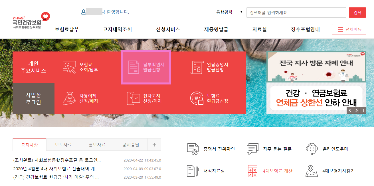로그인하면 첫페이지 상단에서 "ooo님 환영합니다." 라는 텍스트를 볼 수 있다. 메뉴 아래에 개인 주요서비스 > 납부확인서 발급신청 아이콘을 클릭한다.