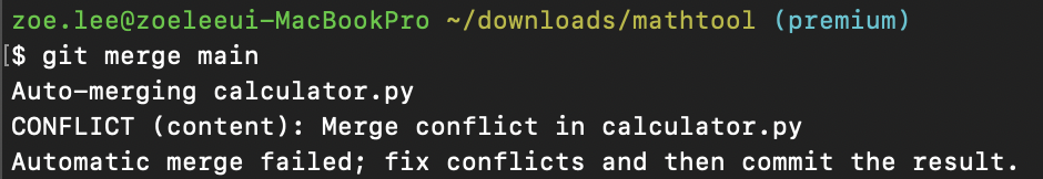 나는 premium 이라는 브랜치와 main 이라는 브랜치 위에서 각각 작업을 했다. 그 다음 다시 premium 브랜치로 이동해서 main 브랜치의 작업 내용을 가져와 합치기로 했다. 그래서 git merge main 이라는 커맨드를 입력하고 실행시켰는데, 아래와 같은 오류 메세지가 떴다.